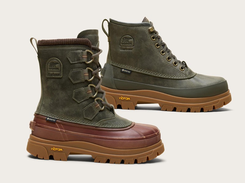 The two recently launched lines, SOREL x BARBOUR DAYSTORM and CARIBOU HORIZON, share similar design structures, with differences defined by shaft heights and closure systems. One model features flat laces threaded through eyelets, while the other uses tubular laces passing through metal buckles.