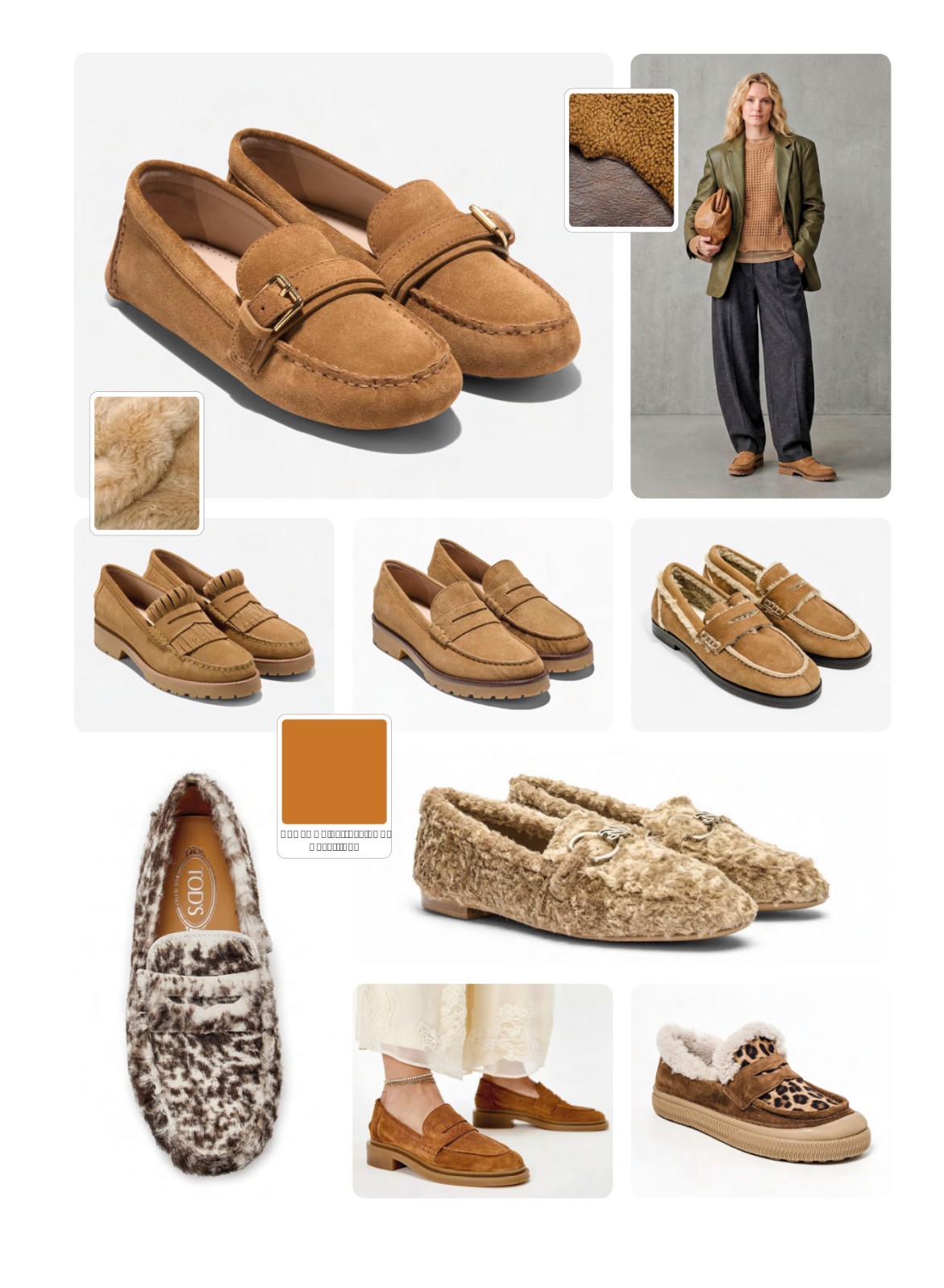 Styles feature metal hardware straps, traditional penny details, lugged outsoles and mid-thickness bases that enhance seasonal adaptability. Fully textured uppers and visible lining details emphasize thermal comfort as a functional attribute. Animal patterns and two-tone finishes introduce expressive variation within a warm neutral palette.