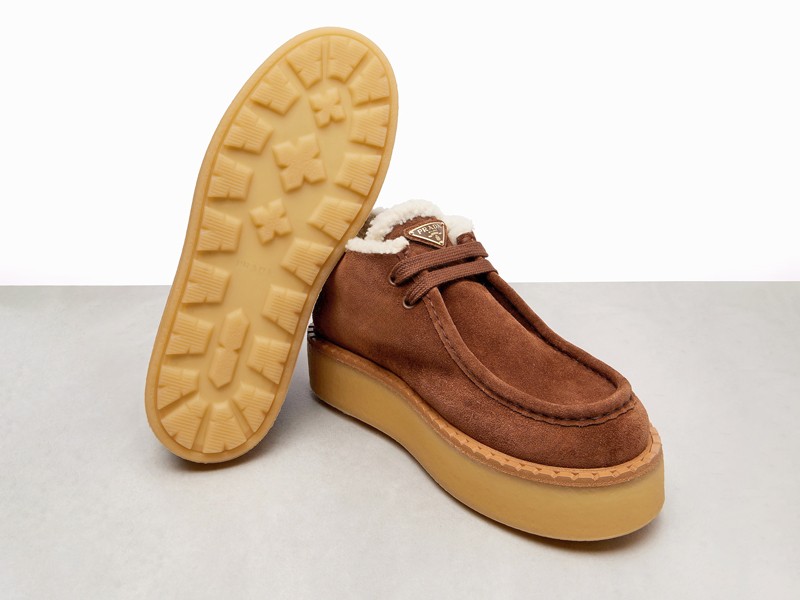 Se trata de la colección Desert Boots, que presenta una estructura de caña incipiente elaborada en gamuzas, con forro lanar ovino. La capellada exhibe el clásico corte Wallaby, con costurón pronunciado y cordonera corta. En estos modelos es llamativa la suela por su espesor -plataforma flat- con vira incluida, que le da un toque moderno y robusto distintivo de PRADA.