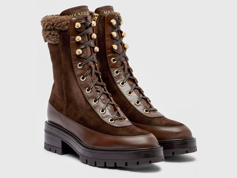 The upper presents contrasts between the perimeter band (over the sole) and the lacing system in semi-lustrous leather, set against the opacity of chocolate-colored suede. The fitted shaft features long lacing systema with flat leather laces, finished at the top with a sheepskin trim.